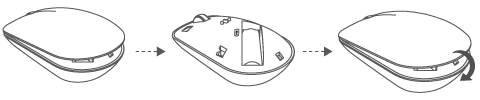 如下图所示,沿鼠标尾部标志打开上壳,按电池仓正负极(+-)的标志安装一节 AA 电池,合上上壳,即可安装完成。